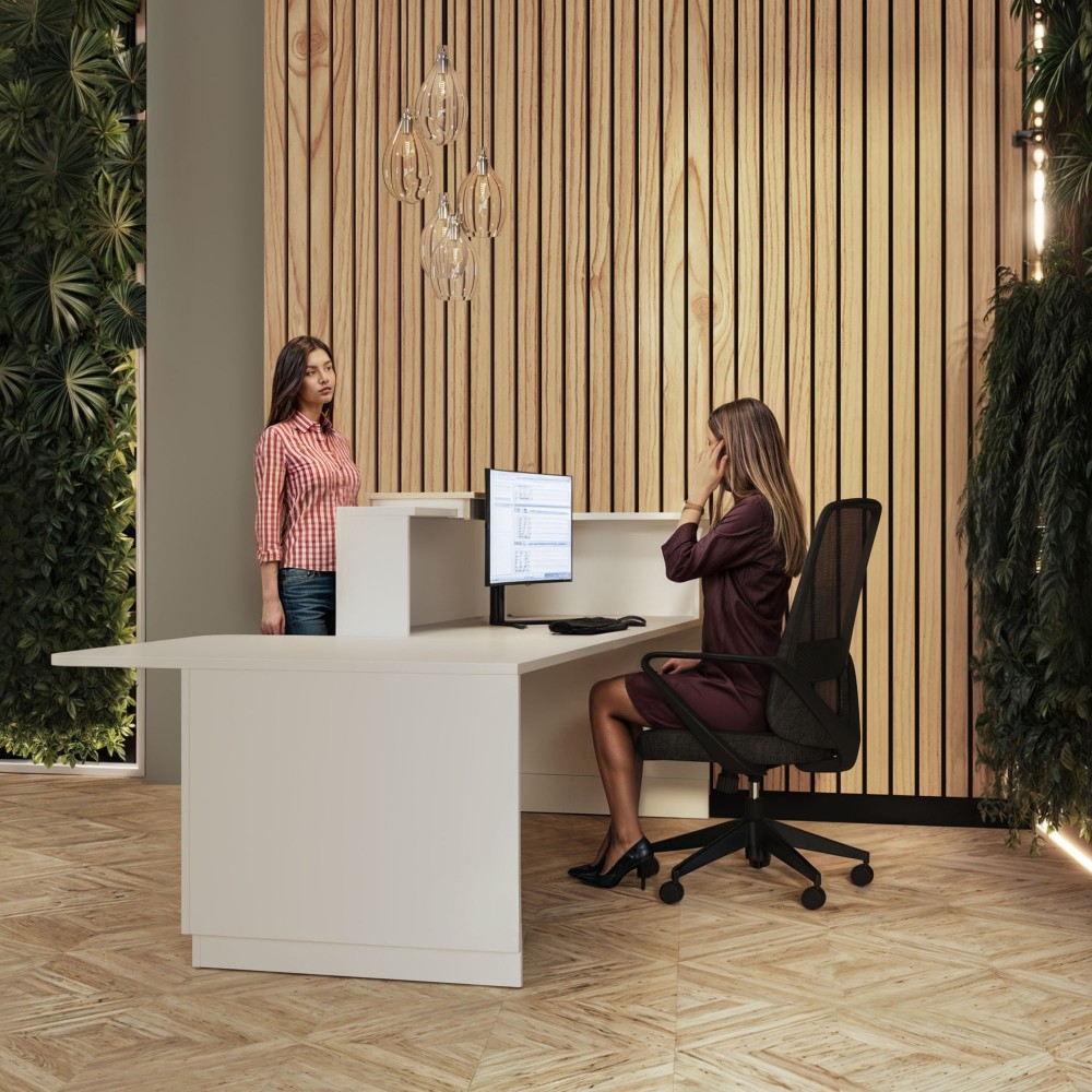 Faites une excellente impression avec notre Pack banque d'accueil PMR. Économisez avec ce pack qui comprend la banque d'accueil PMR Duomo et la chaise ergonomique Agata. Si vous voulez une banque d'accueil élégante et moderne voici votre option. Configurez-la !